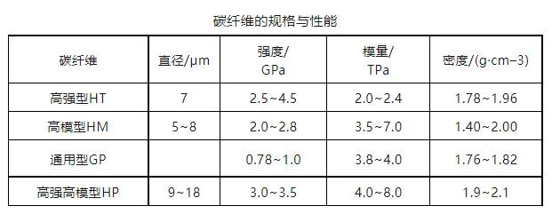 碳纖維作為一種優(yōu)異的增強材料,具有比強度和比模量高、密度低、熱膨脹系數(shù)小、摩擦系數(shù)低、伸長率低、耐低溫性能良好等優(yōu)點??筛鶕?jù)不同領(lǐng)域的應(yīng)用需求選取不同規(guī)格、不同性能的碳纖維。碳纖維的規(guī)格與性能見下表。