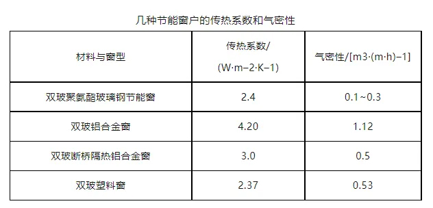 聚氨酯拉擠門窗型材成型中,無苯乙烯揮發(fā),避免了環(huán)境污染,符合“綠色環(huán)?!崩砟?。由于玻璃纖維具有良好的阻燃性和耐熱性,使聚氨酯拉擠材料本身具有防火性能;而且聚氨酯拉擠門窗型材傳熱系數(shù)僅有0.22W/(m2·K),熱阻為9.96mK/W,保溫性能較好。幾種節(jié)能窗戶的傳熱系數(shù)和氣密性見下表。