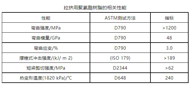 聚氨酯用于拉擠成型具有黏度低、成型速度更快的工藝優(yōu)勢。拉擠用聚氨酯樹脂典型的相關(guān)性能見下表。