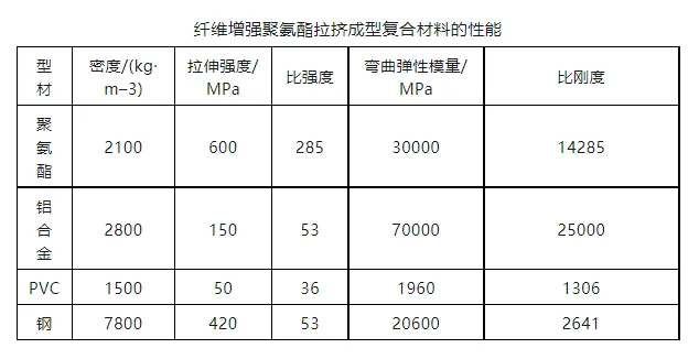 以拉擠工藝制備的聚氨酯附框為例,其中無需支撐骨架便具有優(yōu)異的力學性能,拉伸強度和比強度等性能是PVC(聚氯乙烯)塑料門窗的10倍以上,遠大于鋁合金與鋼,而密度僅有鋼材密度的1/4,鋁合金密度的1/2。拉擠成型的纖維增強聚氨酯復(fù)合材料的性能見表。