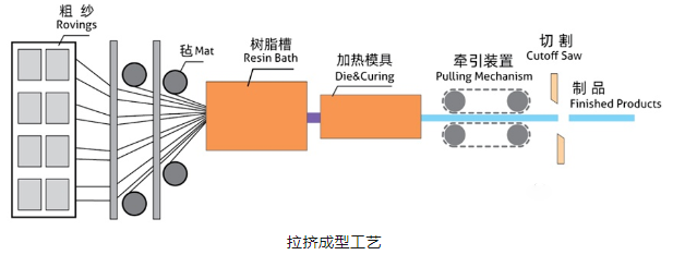 拉擠成型工藝是指將粗紗和氈在牽引設(shè)備的拉引作用下經(jīng)過樹脂槽浸漬,然后進入到加熱模具中固化,經(jīng)過切割形成最終制品。
